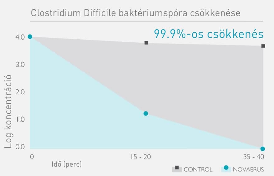 A Novaerus Defend 1050-es készülék aeroszolizált Clostridium difficile spórákra gyakorolt hatását egy 28,5 m3 -es zárt tesztkamrában vizsgálták. A tesztkamrában előzetesen a hőmérsékletet 20 ± 3 °C-ra, a páratartalmat 50 ± 10%-ra állították be.