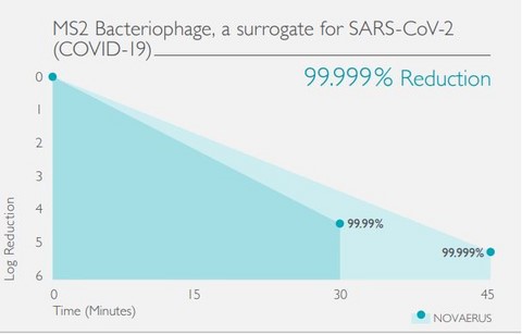 The Defend 400 achieved a net LOG reduction of MS2 bacteriophage virus after 45 minutes of 5.31 which is equivalent to a net percent reduction of 99.9995%.